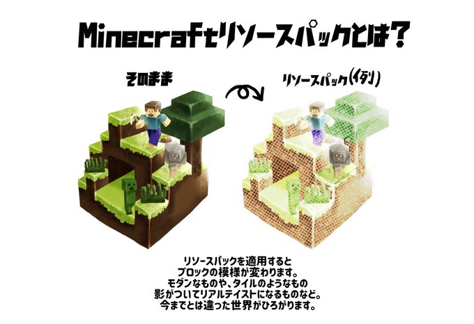 3/05/ · コマンドURL サイト内の下の方にリソースパックって書いてあるのでそこからテクスチャはDLしてください。 訂正 フレイムスクロワー → フレイムスロワー /give MinecraftID command_block でコ · リソーパック導入方法 まとめ マイクラでリアルな建築がしたい、洞窟などの探検をもっとホラーな雰囲気にしたいなど、デフォルトにはない『あと一歩』を満たしてくれるリソースパック。 · Default 3D 次は、マイクラのブロックを3Dで楽しめる Default 3D。 これは、マイクラのほとんどすべてのブロックを立体的にしてくれるちょっと変わったリソースパックです。 レンガや石、木材などにも凹凸がつくのが面白い。 ブロックそのものにデザイン性があるので、普通の豆腐ハウスを建ててもいい感じのログハウスに見えるのもありがたいところです